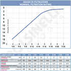 I controlli sempre più accurati della nostra produzione ci hanno permesso di definire un grafico con indicazioni tecniche che oltre alle portate specifiche evidenzia la porosità statistica e il potere di ritenzione di ogni singolo strato filtrante.