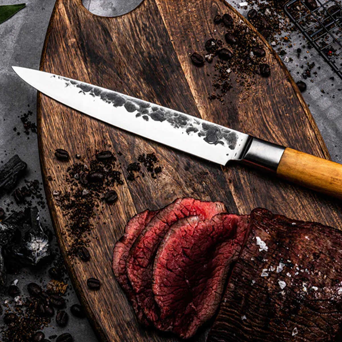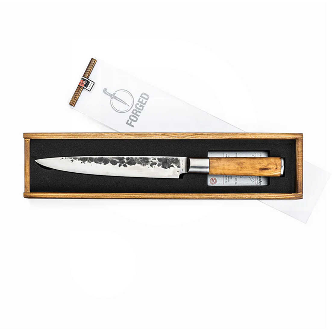 Realizzati a mano con acciaio giapponese 440C (58 HRC), i coltelli della linea Forged Olive uniscono estetica ed ergonomia: la lama martellata e il manico in legno d’ulivo naturale conferiscono un look unico, mentre il manico tondo bilanciato con pomolo finale assicura una presa comoda e sicura.