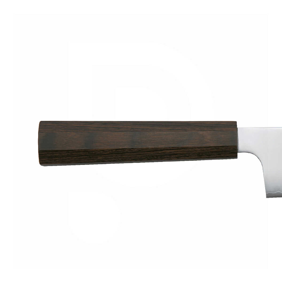 Il manico ottagonale in Pakka wood scuro, progettato da designer esperti, offre un’impugnatura ergonomica e bilanciata. Questa combinazione assicura controllo preciso, stabilità durante l’uso e un taglio fluido e senza sforzo, ideale sia per chef professionisti che per appassionati di cucina.
