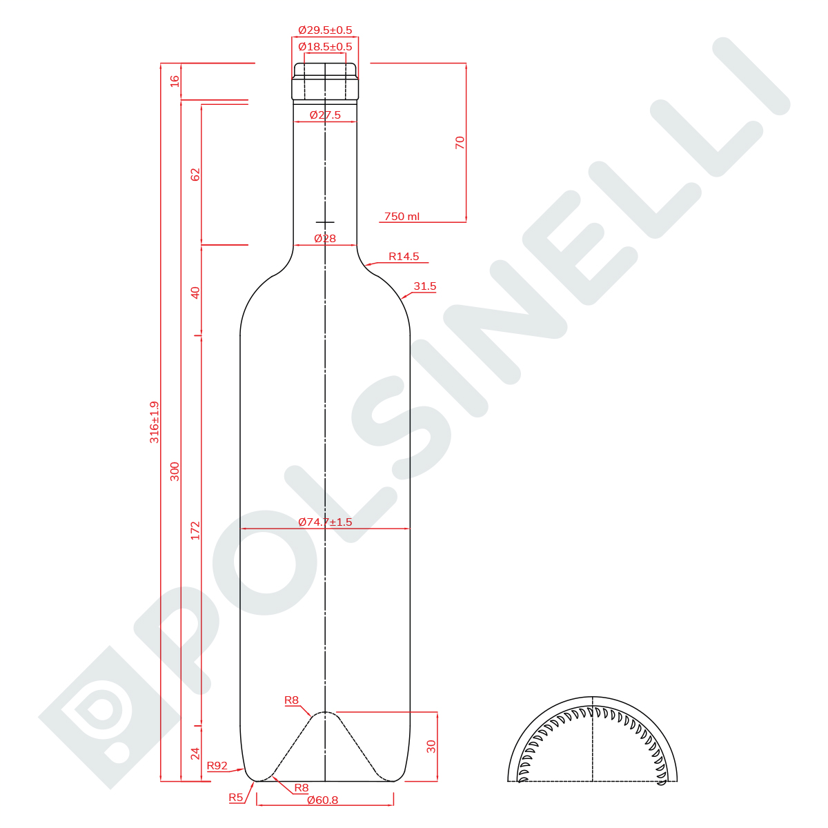 Im Vergleich zu den Flaschen der gleichen Familie unterscheidet er sich durch seine Robustheit und durch die Dicke des Glases, die perfekt für eine lange Lagerung des Weines geeignet ist.