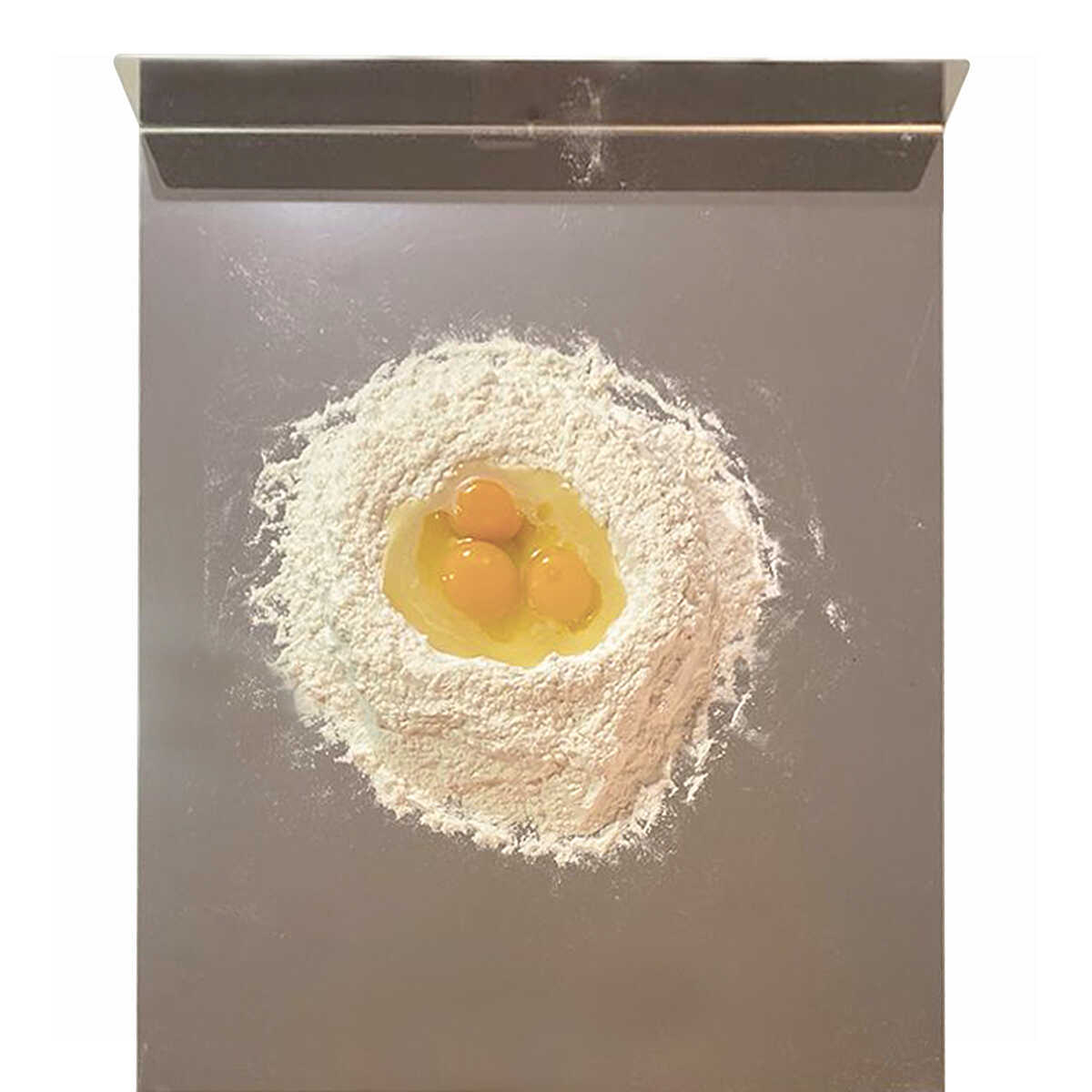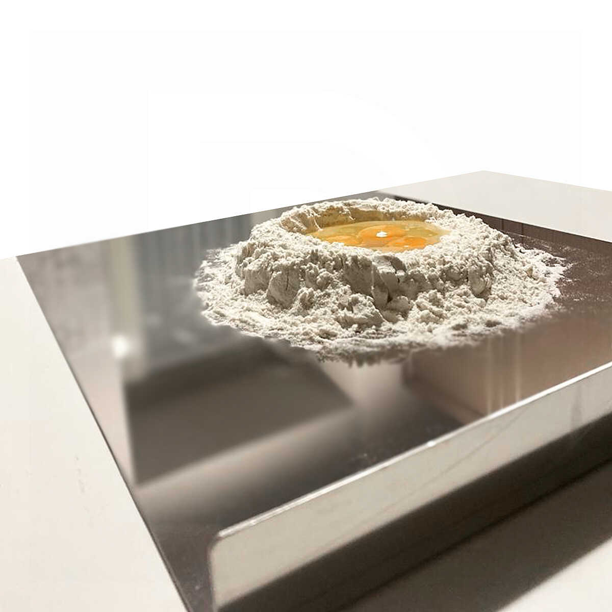 Das Backbrett ist hochglanzpoliert und antihaftbeschichtet, so dass der Teig nicht an der Oberfläche kleben bleibt, und der 40 mm hohe Rand verhindert, dass die Speisen auf den Boden fallen.