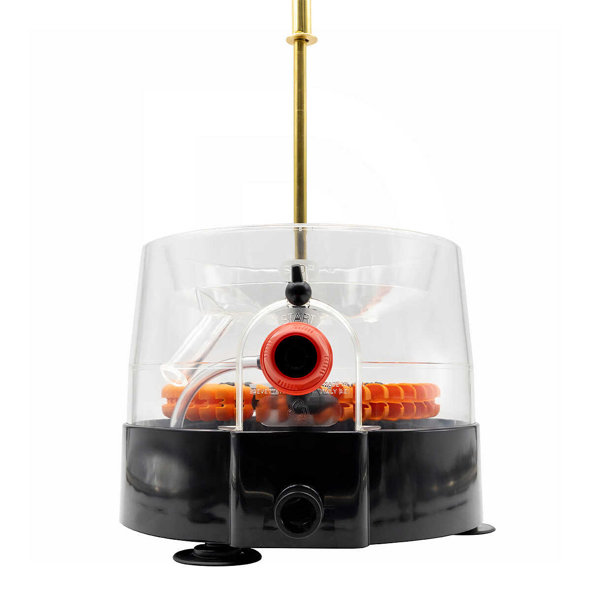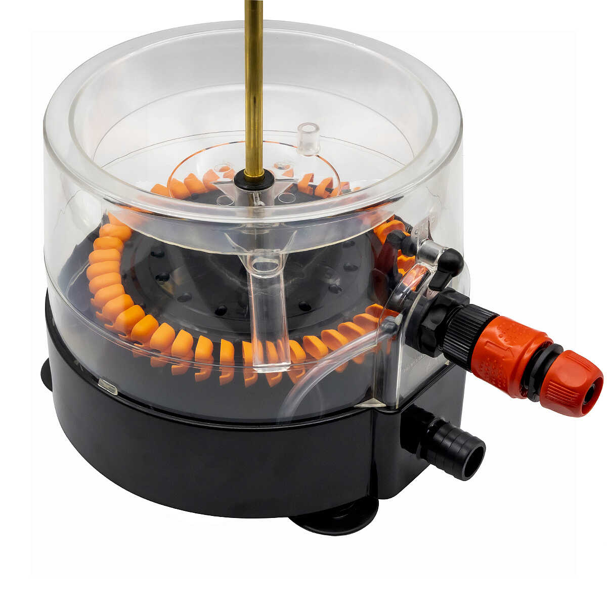 Einfach genial, seine Funktionsweise basiert nur auf dem Wasserdruck der, eine innere Turbine aktiviert, die rotierenden Metallbürsten bewegt und, zusammen mit dem Wasserstrahl, eine gründliche Reinigung der Flaschen garantiert.