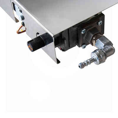 Gabrenner aus verchromtem Stahl mit Sicherheitsventil, Pilotflamme und piezoelektrischer Zündung.
