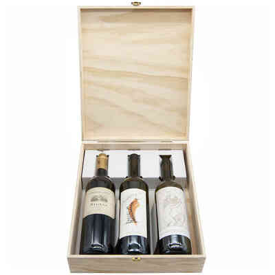 Holzkiste, ideal als Geschenkbox. Sie fasst 3 x 750 ml Flaschen und hat einen Schiebedeckel. Im Inneren des Kartons befindet sich eine Trennwand aus Pappe, die verhindert, dass die Flaschen aneinander stoßen.