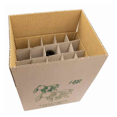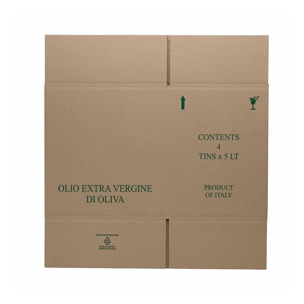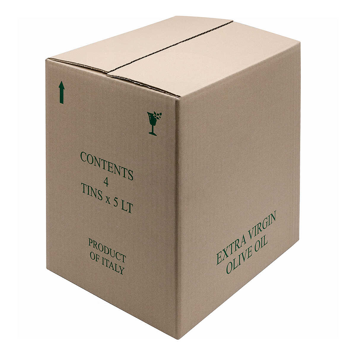 Robuste Schachtel gefertigt aus Wellpappe zur Verpackung von 4 Öldosen von 5 Liter.