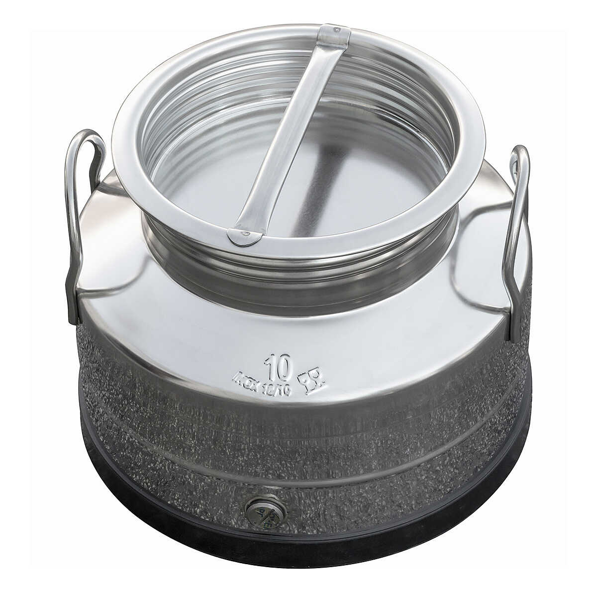 10 liter stainless steel 18/10 drum for foodstuffs, with welded smooth bottom for easy cleaning and protective plastic ring on the bottom. Set up with tap and gasket. Equipped with carrying handles.