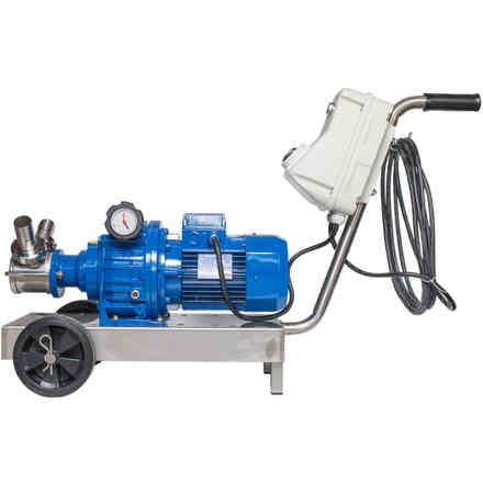 The P30 AT progressive cavity electric pump with inverter consists of a motor, an internal rotor and a practical trolley with wheels and handle, ideal for transporting it. It is a tool designed for transferring food liquids even at high temperatures, perfect for wine, olive oil, beer and milk producers. The P30 AT single-screw electric pump with inverter does not affect in any way the organoleptic properties of the transported products, respecting the power standards of D.M. 21/03/73. The rotor is powered by a 0.55 kW three-phase 4P electric motor, and has a speed range of 10 to 2000 rpm, for a flow rate of 2 to 42 hl/hour. The inverter of the P30 AT single-screw electric pump is very useful for controlling the speed, torque and acceleration of the motor, and optimising the consumption of the device.