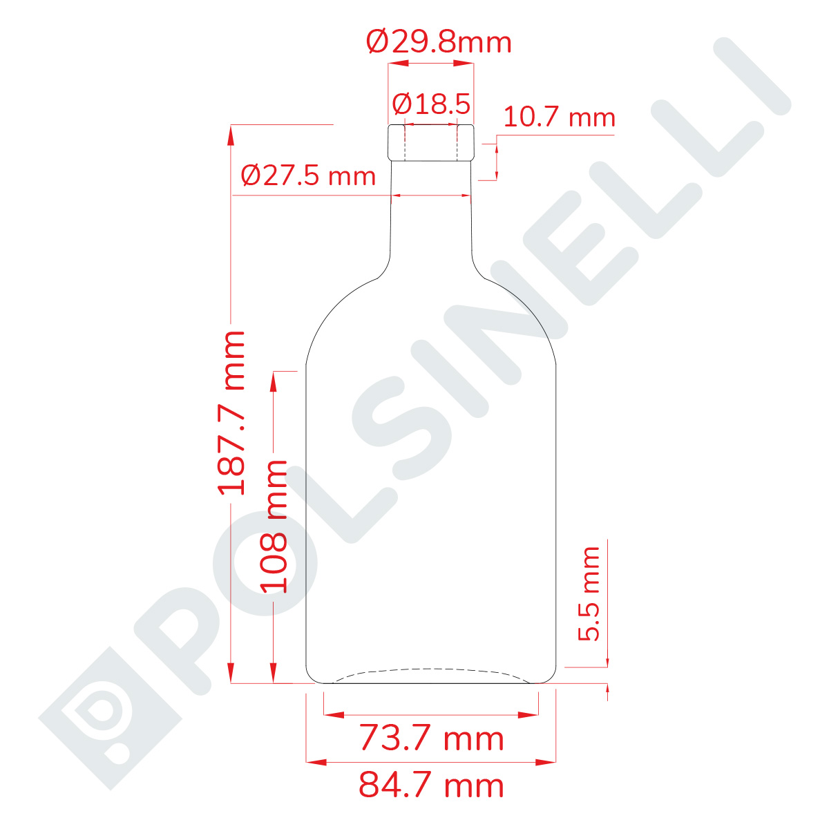 With a height of 185 mm and a diameter of 85 mm, this bottle offers a solid and well-balanced structure, ideal for storage and presentation. For optimal sealing, as the inner neck diameter is 18 mm, it is recommended to use Ø19 mm synthetic mushroom stoppers, ensuring a hermetic seal that preserves aroma, freshness, and quality over time.