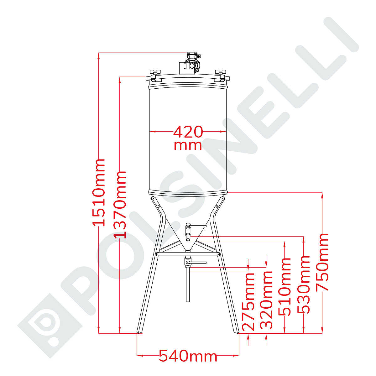 The 60° conical trunk facilitates the extraction of sediment that settles at the bottom of the cone, allowing for greater cleaning. TIG welds facilitate cleaning and sanitising operations thanks to the mirror-polished interior. Excellent stability thanks to the integrated pedestal.