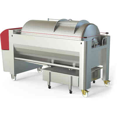 Elevator belt with food-grade PVC belt, 300 mm wide, suitable for transporting whole grapes, destemmed grapes and fermented pomace, built entirely in AISI 304 stainless steel with height-adjustable frame on wheels. Complete with loading hopper, liquid recovery tank and electrical panel.
