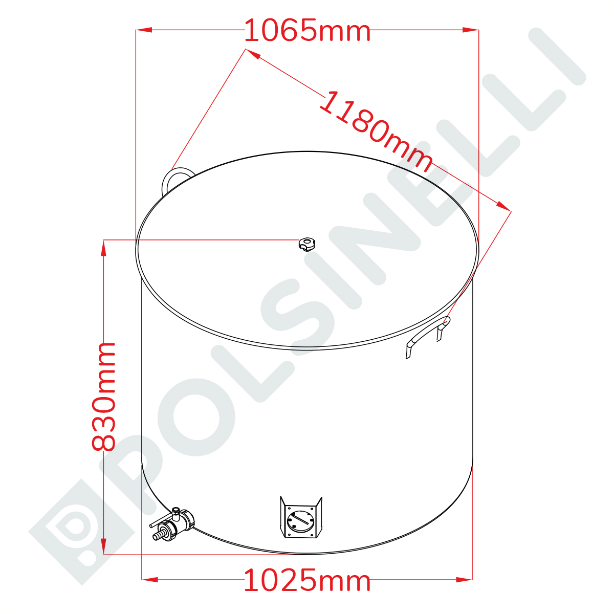 The 660 litre stainless steel brewing pot is a professional quality product designed to meet all the needs of professionals and homebrewing enthusiasts thanks to highly specialised manufacturing. Made of 18/10 stainless steel (AISI 304), an extremely resistant and chemically inert material, the 660 litre brewing pot for sale on Polsinelli allows you to respect the organoleptic characteristics of the product contained and guarantees efficient brewing, thanks also to the 2 mm thick bottom that diffuses heat optimally in the absence of active insulation. This model is fitted as standard with a stainless steel lid with knob, two ergonomic handles that make it easy to move the 660 litre stainless steel pot, and a welded DIN 25 F stainless steel fitting for connecting a stainless steel valve of the same diameter. It also incorporates a professional analogue thermometer with a protective cover. With a diameter of 1025 mm and a height of 800 mm, the 660 L brewing pot is able to fit into any brewery space.