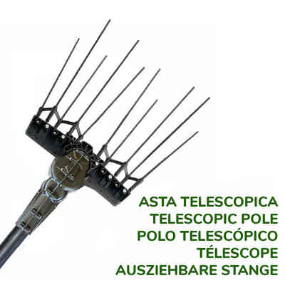 The Twigo 2.0 Aima electric shaker with fixed pole is a tool designed for harvesting all types of olives, pistachios and coffee. Thanks to the opposing horizontal movement of the combs (10 combs of 5+5), the low weight of only 2.200 kg, the fixed pole and the 1 metre extension, the Twigo 2.0 Aima allows you to work safely and comfortably. The 370W motor with fixed speed of 1550 RPM is powered by a standard 12V battery (not included) to be connected to the 14-metre power cable supplied. The fixed pole reaches a length of 2500mm.