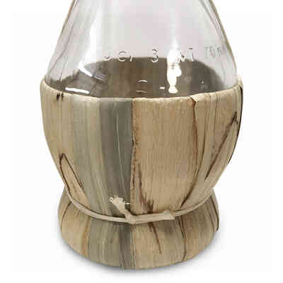 Wicker wine bottle with straw weave to reinforce the bottom and walls. Suitable for storing wine, oil and various preparations.