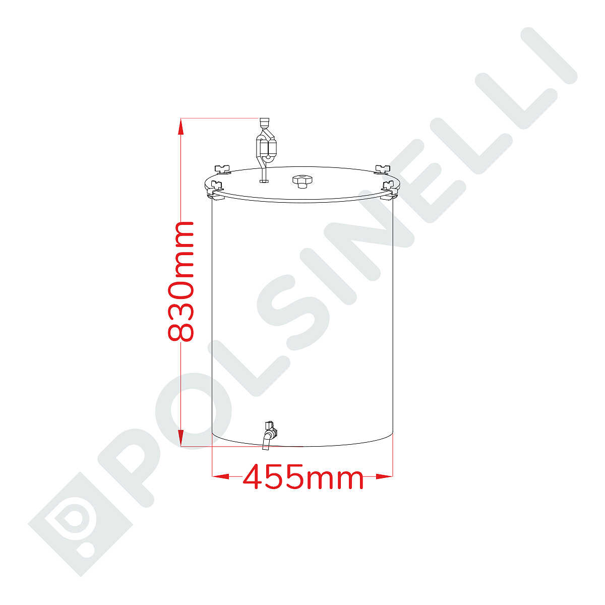 Il prodotto è completo di coperchio ad alto spessore con gorgogliatore e rubinetto inox rialzato dal fondo per evitare di prelevare i lieviti e altre fecce che si sono depositate durante la fermentazione.