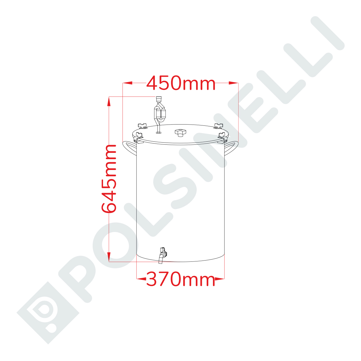 Il prodotto è completo di coperchio ad alto spessore con gorgogliatore e rubinetto inox rialzato dal fondo per evitare di prelevare i lieviti e altre fecce che si sono depositate durante la fermentazione e di comode maniglie per lo spostamento.