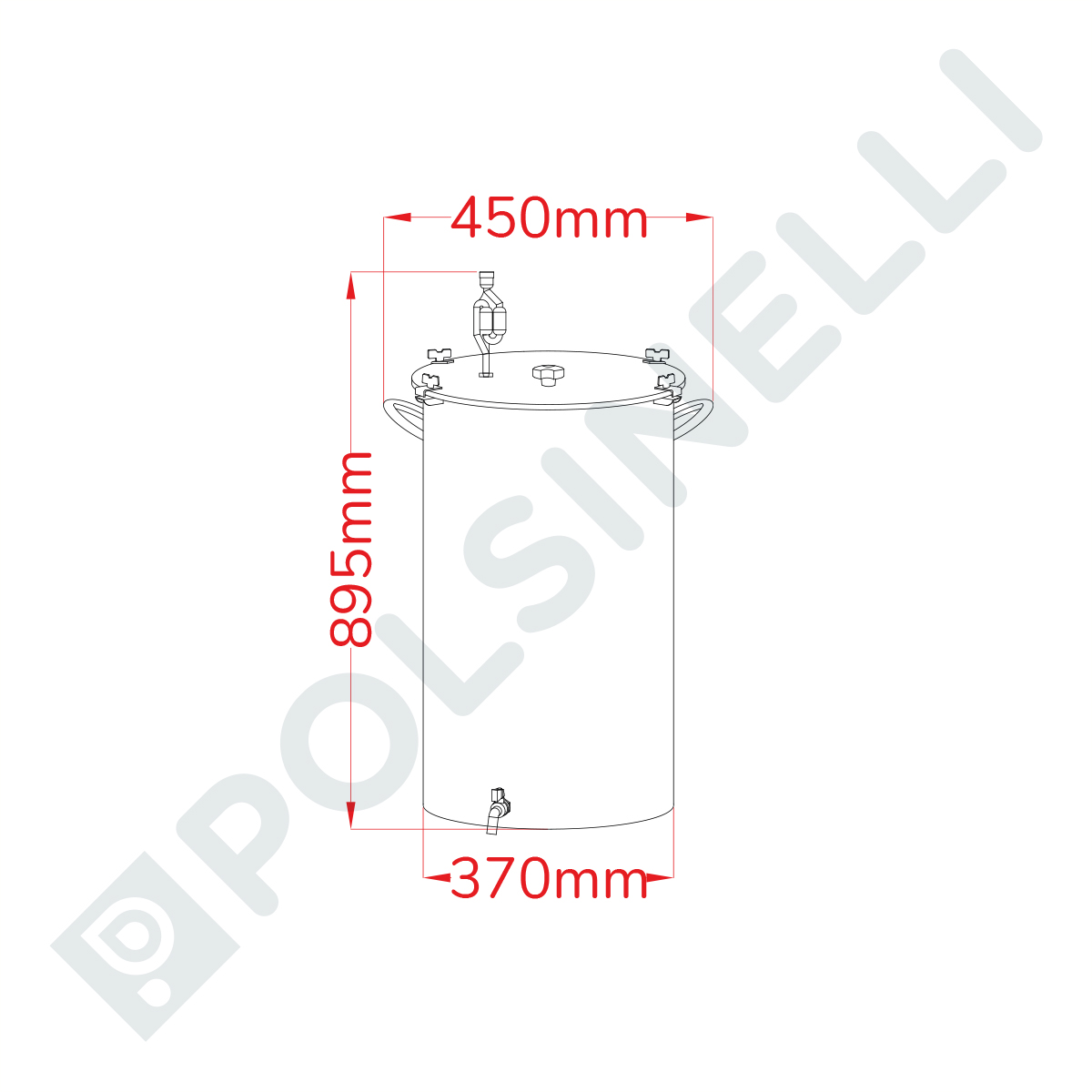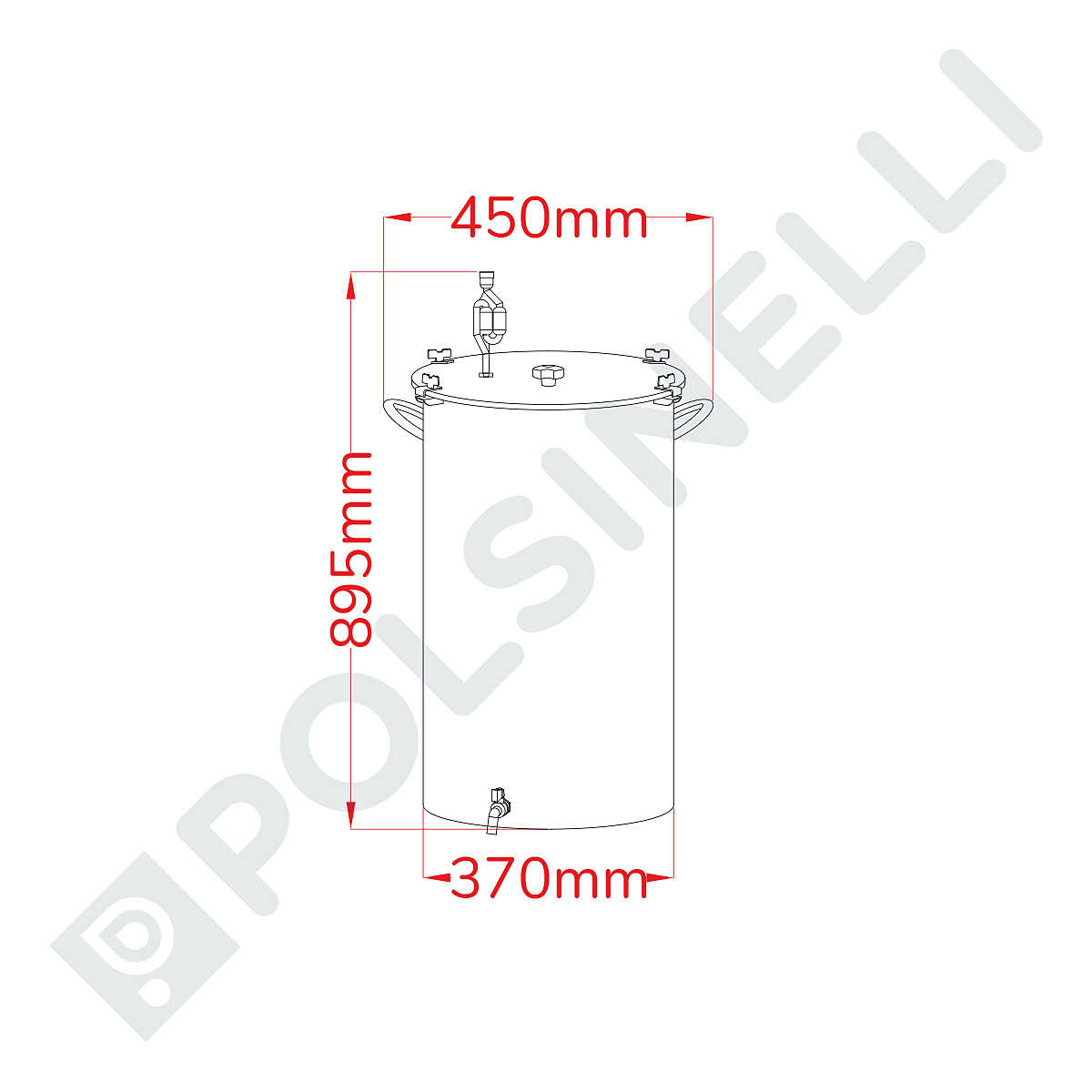 Il prodotto è completo di coperchio ad alto spessore con gorgogliatore e rubinetto inox rialzato dal fondo per evitare di prelevare i lieviti e altre fecce che si sono depositate durante la fermentazione e di comode maniglie per lo spostamento.