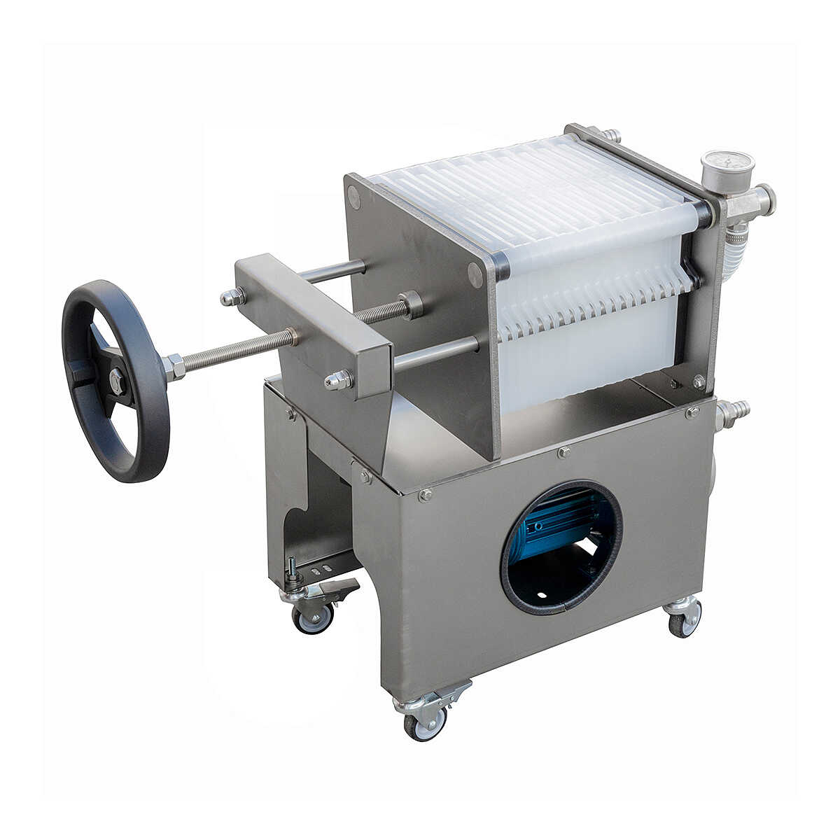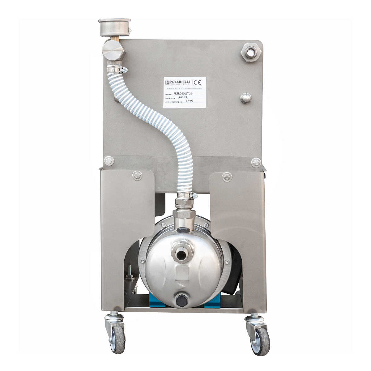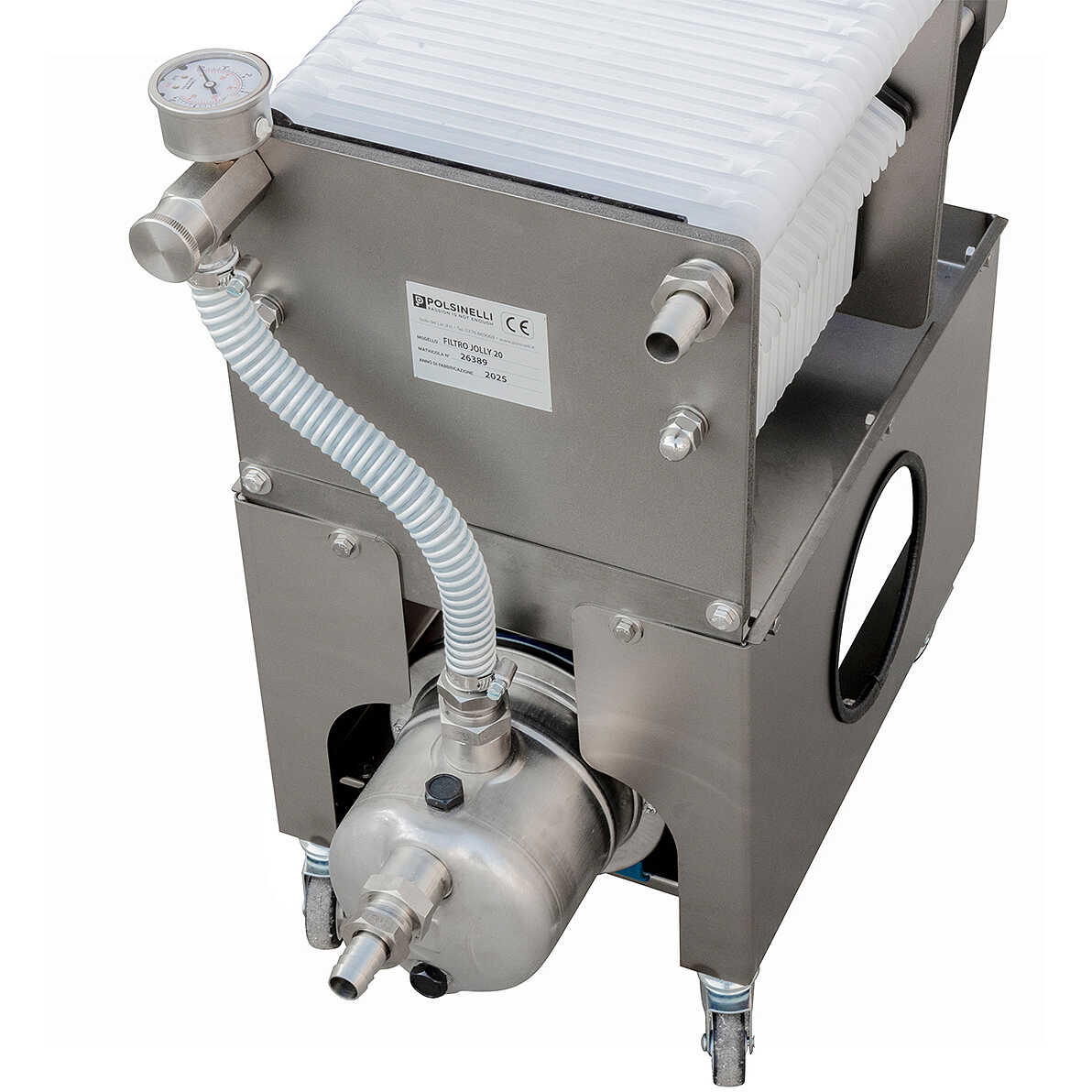 La struttura del Filtro Jolly 20 è realizzata in acciaio inox AISI 304 e consiste in un telaio e un carrello dotato di 4 ruote, di cui 2 con freno, per garantire facilità di spostamento e praticità d'uso.