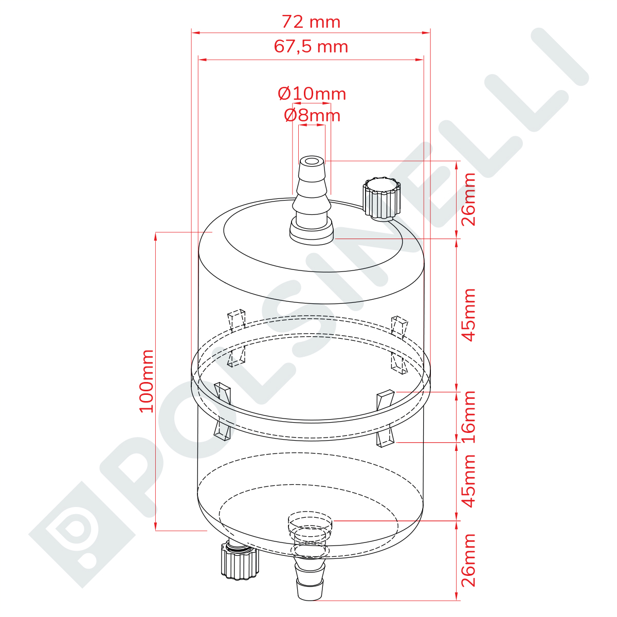 Realizzato interamente in polipropilene, il filtro viene inserito tra la pompa del vuoto e il vaso di recupero per trattenere al suo interno zucchero ed eventuali particelle che, durante il processo di imbottigliamento, potrebbero accumularsi all’interno della pompa stessa.