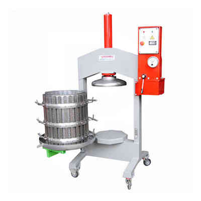 Le pressoir a une capacité interne de 40 litres et son fonctionnement n'utilise que la pression d'air générée séparément par un compresseur qui développe au moins 3 bars en introduisant de l'air dans une membrane en caoutchouc naturel qui, en gonflant, presse uniformément les fruits contre les parois de la cage perforée.