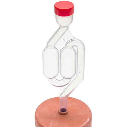 Composto da un cappellotto in gomma da inserire direttamente sul contenitore nel quale avviene la fermentazione. Questo strumento consente, una volta inserito acqua, nel contenitore trasparente fino a circa la metà delle due bolle, la fuoriuscita dell’anidride carbonica mentre blocca l’ossigeno in entrata che porterebbe all’ossidazione del nostro prodotto.