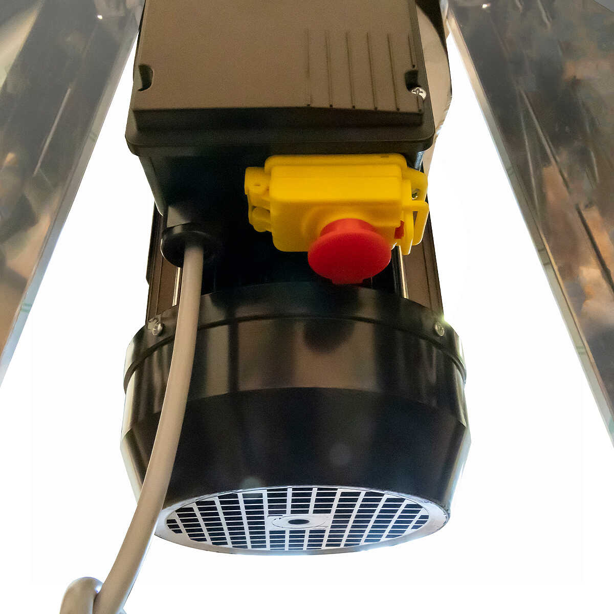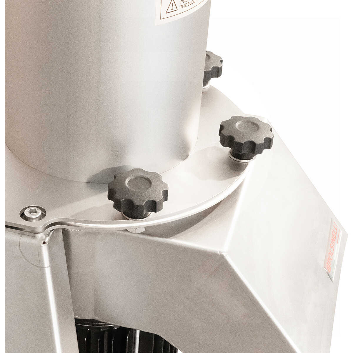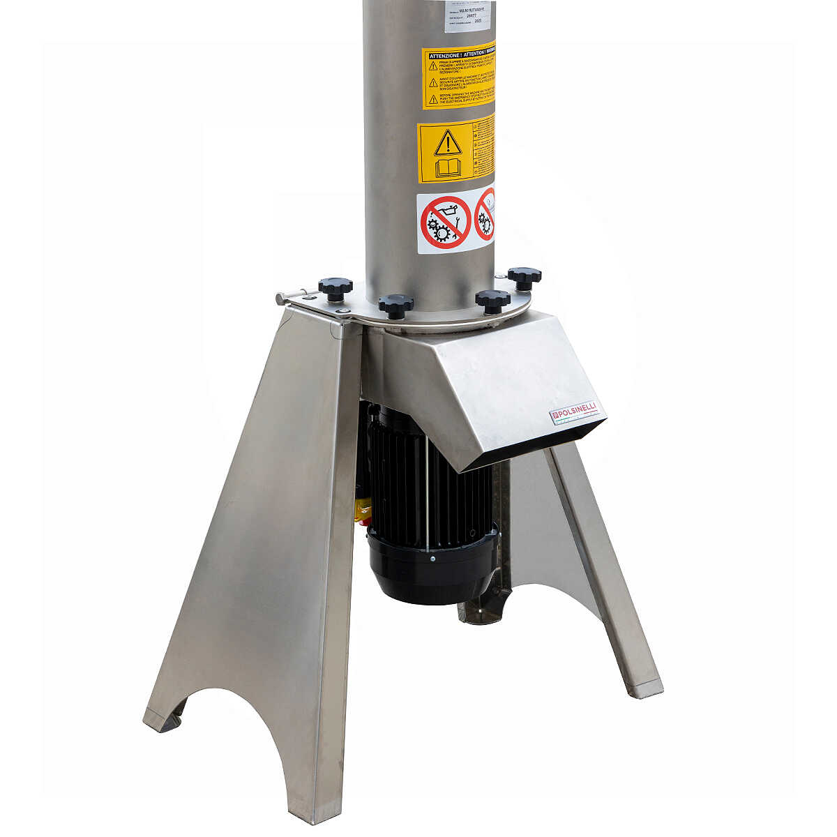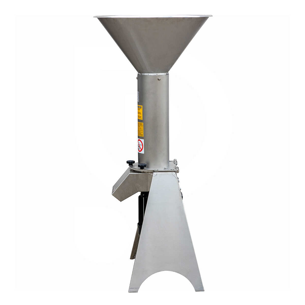 Il mulino elettrico per frutta ha un peso di 45 kg e una dimensione di 110x 61x140 cm, si compone di una tramoggia con una larga apertura per l’immissione, e di una comoda bocca per l’uscita dei prodotti tagliati, sotto la quale si può posizionare agevolmente un contenitore di raccolta di differenti dimensioni. É munito di robusti piedi regolabili e dotato di un sistema di arresto di emergenza all'apertura, che assicura il massimo della sicurezza durante l’utilizzo.