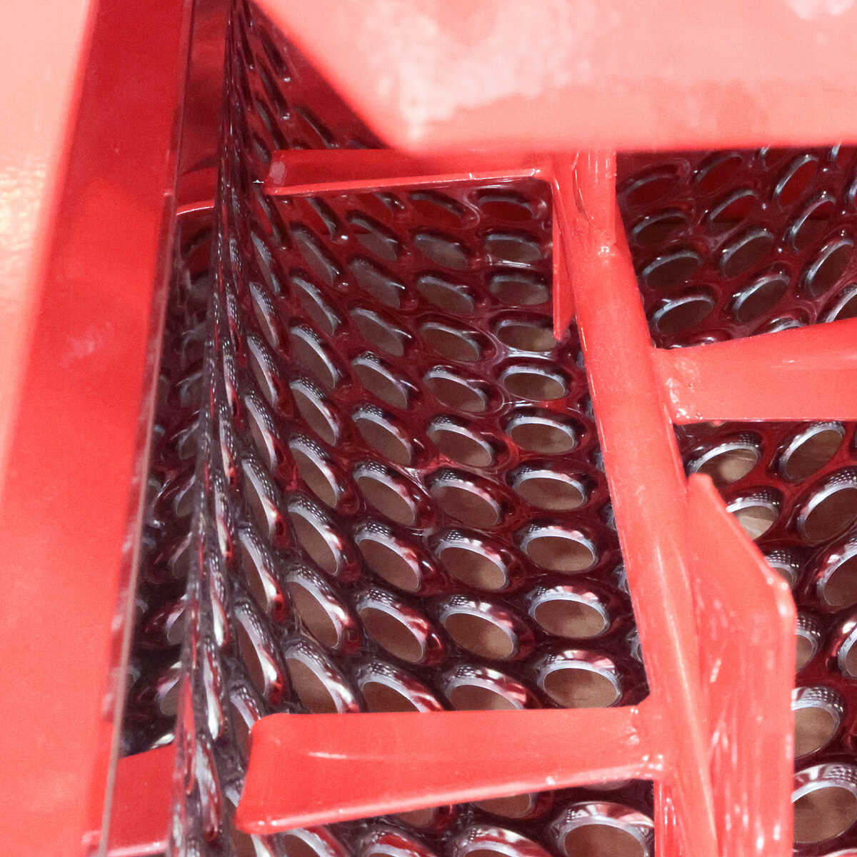 - Le staffe di sostegno della tramoggia sono agganciate sulla parte superiore, cioè dove andiamo a poggiare la cassetta con l’uva. I nostri concorrenti ne mettono una sola in basso, con notevole risparmio, ma a discapito della robustezza.